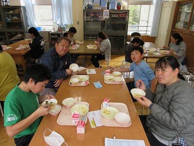 2~4校時には各学級の参観授業や学級懇談を行いました(今回は全ての学級で複式指導の様子を見ていただきました)。保護者の皆様に、この一年間の子どもたちの成長や今後の目標などについて見たり考えたりしていただきました。給食時間には、5・6年生の親子給食を行いました。6年生にとっては最後の親子給食でした。家族で楽しく過ごすことができたようです。