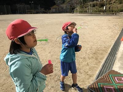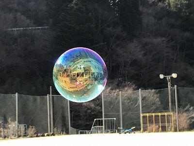 ※今朝は、0度近くまで気温が下がりましたが、快晴で空気が澄んでいる中、真っ青な空とシャボンだまの虹色がとても幻想的でした。大きなシャボンだまに、尾向小の校舎が写っています。