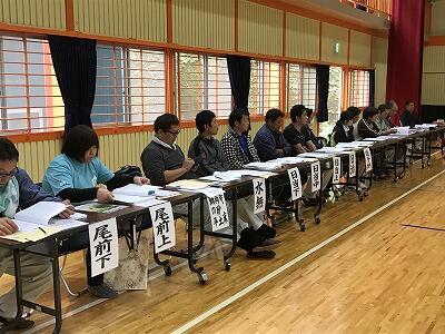 椎葉中学校の授業参観後、体育館にて、「知」「徳」「体」に分かれて、本年などの共通実践事項等について話し合いを行いました。
