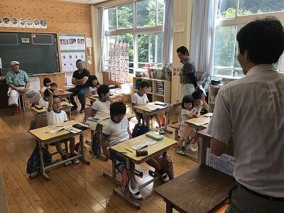 【お勉強では、2年生のお兄さん、お姉さんと同じ教室で、初めての複式学級でのお勉強でした】↓