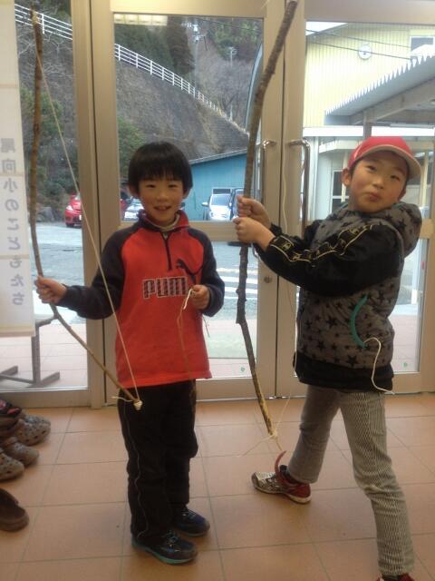 ・ 子供たちは遊びの天才・・このことは以前も記しました。本当に子供たちは寒くても暑くても外でよく遊びます。今日も風が強くとても寒い一日でしたが、昼休みも放課後もサッカーをしたり一輪車に乗ったりしながら、多くの子供たちが運動場で歓声をあげていました。写真は、放課後に落ちていた木とひもで弓矢を作っていた子供を写したものです。矢が激しく飛ばないようにひもの強さを調整していました。また、矢も細く弱い枝を見つけていました。