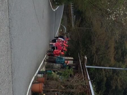 ・ 本地区は、2002年に大災害が起き、多大なる被害があったと聞いています。地域の消防団の方々等のご尽力により、誰一人として亡くなった方はいらっしゃらないようですが、地滑りの後は今もコンクリートの補修により残っています。その災害を忘れぬよう、学校入り口にパネルが掲示してあり、その災害の概要が記してあります。写真は、2年生が担任とともにそこを見ているところです。安全意識の高揚につながっていると良いです。