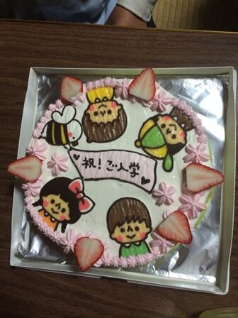 ・ 入学式後は、当然のことながら「祝賀会」が近くの民宿で開催されました。保護者、来賓、職員と多くの方が参加され賑わいました。その際に、調理員のOさんが、入学児童のためにケーキを作ってきてくれました。ケーキには、4名のイラストも入り、とても手の込んだものでした。