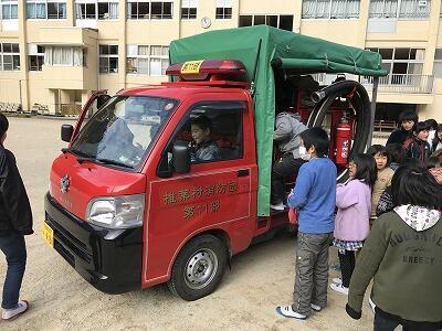 避難後は、火災の種類や、火災の際に気をつけることや予防についてのお話、消火器の使い方を指導していただいたあと、積載車を見せていただき、子どもたちは、実際に乗せていただいたり、ホースを触ったりさせていただき喜んでいました。
