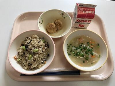 献立は、ひじきごはん、じゃがいもの味噌汁、あべかわもち、牛乳でした。