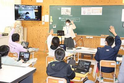 研究授業では、3・4年生の算数(複式指導)と5・6年の社会科(ユニット学習)を見ていただきました。社会科では、5年生を不土野小の先生が、6年生を本校職員が指導しました。複式解消を目的としたオンラインの学習で、これまでの研究・実践の成果を村内の先生方に紹介することができました。