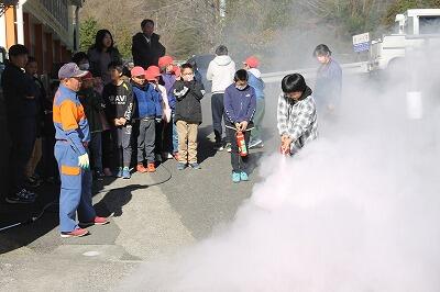 次に、消火器を実際に使っての消火訓練を行いました。2名の児童が消火器を使って火を消しました。子どもたちは、予想以上に広がる消火器の煙に驚いていました。子どもたちが消火器を使う機会はほとんどないと思いますが、消火器の存在や使い方を知ることはとても意義のあることだと思います。