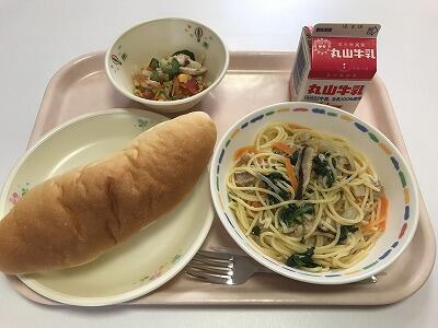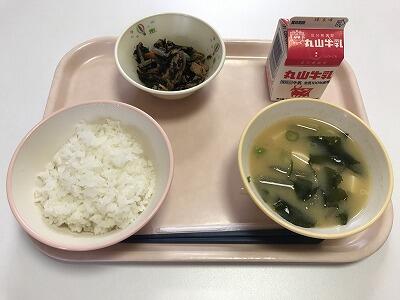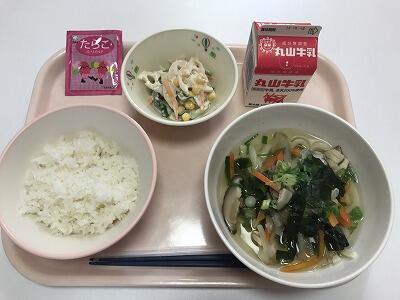 今日の給食は、減量麦ご飯、わかめうどん、れんこんのマヨネーズ和え、ふりかけ、牛乳でした。