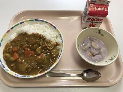 今日の給食は、チキンカレー、ブルーベリーヨーグルト、牛乳でした。