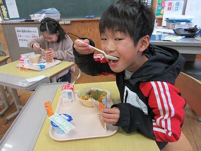 はじめは少し緊張気味の子どもたちでしたが、楽しく笑顔で給食を食べることができました。