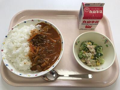 今日の給食は、ハヤシライス、ブロッコリーサラダ、牛乳でした。