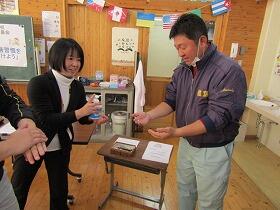 今回は給食室から火災発生の放送の後、素早く整然と避難ができました。避難後は椎葉村消防団第11部の部長に来ていただき、火災の際に気をつけることや予防についてのお話や消火器を使った消火訓練を見せていただきました。