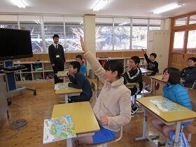 今日は2学期最後のALT訪問日でした。5・6年生の教室では2学期に学習したことの振り返りが行われていました。地図が映された画面を見ながら、「書店に行く道を教えてください」という英語の質問に対して、子ども達は「ゴーストレイト、ターンライト・・・」と巧みに道案内をしていました。たいしたものです。給食の時間は2年生がALTの先生と一緒に楽しいひとときを過ごしました。
