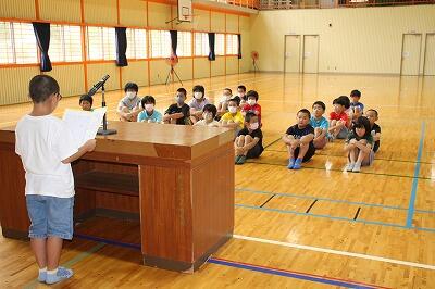 その後、校長から「自立と貢献について1学期にがんばったこと」「1学期に学習した国語についてのクイズ」「水の事故に気を付けること」を話しました。国語についてのクイズは、学年ごとに難しいと思われる内容を出題し、学年で相談して答えてもらいました。1学期にしっかりと勉強したことがよく分かりました。