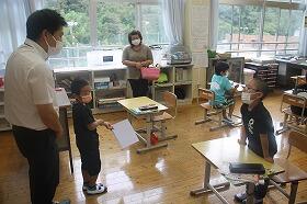 1学期の終業式が21日にありました。児童代表で3年生が友達と協力してカブトムシを育てたこと、水泳のバタ足の練習をがんばったこと、タブレットが上手に使えるようになったこと、姉妹で仲良くできたこと等、1学期にがんばったことの発表をしました。その後、校長から1学期の振り返りと平和の大切さについての話がありました。式の後、7月いっぱいで離任される用務の先生とのお別れ会がありました。72日間の1学期が終わりました。みんな元気にがんばってくれました。8月30日に26人の元気な顔を見るのが楽しみです。