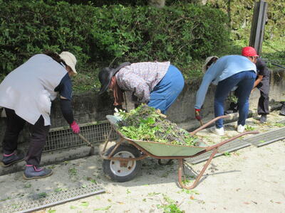 PTA奉仕作業では、草刈り、草抜き、側溝清掃などを行いました。また、梅ちぎり場所の草も刈っていただきました。