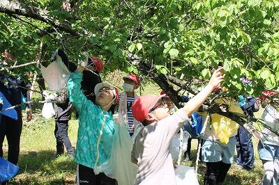 梅の木をいためないように、気を付けて梅を収穫しました。昨年より数は少なかったですが、一つ一つがとても大きく育っていました。学校に戻って計量したところ27kgでした。収穫した梅は各家庭に持ち帰ります。