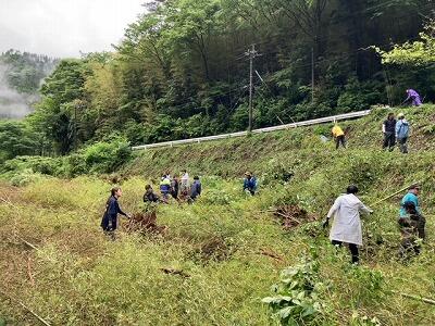6月11日(日)、焼畑体験学習の最初の準備である「やぼきり」を行いました。やぼきりは、焼畑地に生えている草や木を切り、燃えやすい竹や杉を並べる作業です。今年は倉ノ迫(くらのさこ)のかつて田んぼだった土地をお借りしました。