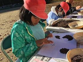 焼畑体験学習「石取り」を行いました。先月収穫し乾燥させたそばの実に混じって、石などの不要物を取り除く作業です。白い紙の上で一粒一粒丁寧に選別していきます。子どもたちは真剣な表情で黙々と取り組んでいました。今月24日の収穫祭で、今日選別したそばの実を石臼でひいてそば粉にしていきます。