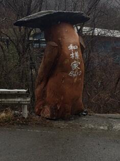 ・ 今年の初め頃だったと思いますが、前公民館長さんの通称「別荘」の上に、写真のオブジェ(看板)?が新設されたのを発見しました。下の茶色の部分は木で上は岩です。自然物を見事に組み合わせた芸術品です。発想がおもしろいし名前もユニークです。