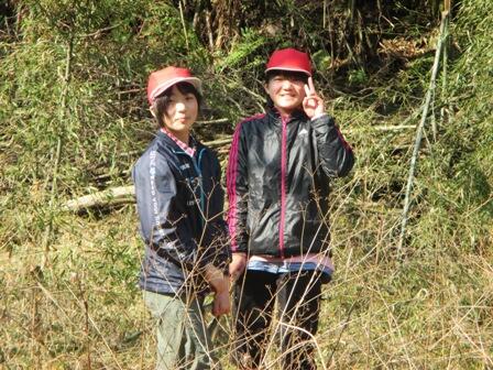焼畑学習の無事を祈り館長さんが「御神酒」を捧げられ作業開始。これまで培われた熟練の技で、急峻な山の斜面をものともせず、竹や雑木を次から次に切り倒し、階段状に並べ、重機を使って大木をつり上げ・・・等、ものすごい速さで作業が進みました。