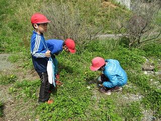 初夏を思わせる日差しの下、3年生は理科の時間に「春の身近な自然」の観察学習をしていました。虫眼鏡片手に、学校の周りの春の草花や虫たちの様子を詳しく絵や言葉で表し、丁寧に記録していました。