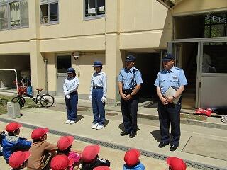 訓練は、椎葉駐在所の方が扮した不審者が玄関から入って来た場面から始まり、気づいた職員が対応し、子どもたちは教室に施錠をして身を守るという流れで行いました。