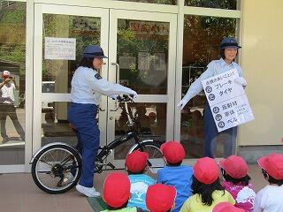 次に自転車の安全点検の方法を教えていただきました。自転車の点検の合言葉「ぶたはしゃべる」(ぶ:ブレーキ、た:タイヤ、は:ハンドル、しゃ:車体、べる:ベル)を学習し、さっそく自分で安全点検をしてみようという意欲にあふれている様子でした。