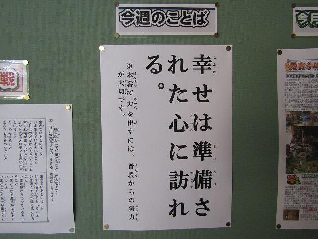 また、玄関の掲示板には、2週間おきに「今週のことば」を掲げています。「勇気」がわき、「元気」が出て、「根気」強くなり、「本気」になり、「平気」になり、「気づき」をくれることばを掲示し、子ども達を伸ばしていきたいと思っています。
