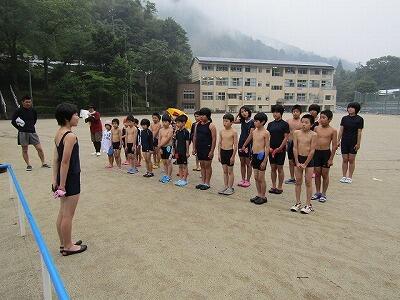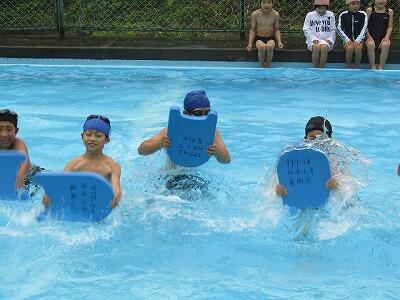 梅雨まっただ中、雨模様の毎日ですが、気温が少しずつ上がってきて、水泳指導がやっと本格化してきました。今日は、3・4年、5・6年がプールに入りました。3・4年は、水中宝探し・だるま浮き・クラゲ浮き・大の字浮き等水に慣れる運動を楽しそうにやっていました。5・6年はさすがに泳ぎが上手く、ふし浮き・けのび・クロール・平泳ぎと本格的な泳ぎの練習をしていました。7月には村の水泳大会もあることから、これから益々練習に熱が入ることでしょう。