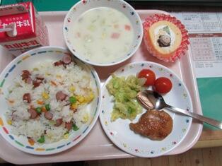 ・ クリスマスメニューでした。チキン、チャーハン、ミニトマト、そしてケーキ。どれもとてもおいしかったです。子ども達も、2学期の最後の給食をとても満足そうな顔をしていただいていました。