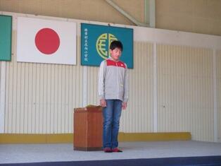 ・ 今年の代表は6年生のS君です。今日も昼休み時間に体育館で練習をしました。いい声が出るようになって来ました。今晩、明日と自宅で練習を重ね、当日を迎えるように話しました。緑の少年団の全国大会にも一緒に行き、本児の活動ぶりを見ていましたが、本番に強い児童なので、練習以上の姿を見せてくれると思っています。頑張れS君。