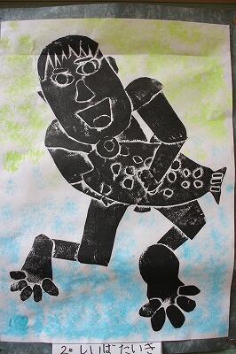 1・2年生は紙版画です。紙からはみ出すくらい迫力のある作品ができました。1・2枚目が2年生、3枚目以降が1年生です。
