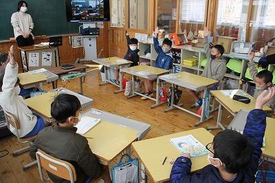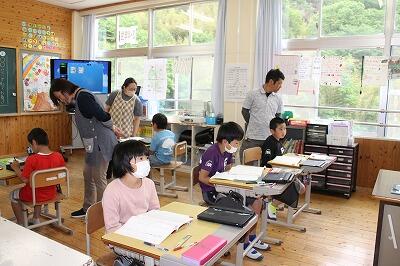 1日目の昨日は、国語や体育(水泳)、外国語や道徳などを他の小学校の子どもたちと一緒に学習しました。いつもは複式学級で5・6年生が一緒に学習していますが、集合学習では自分と同じ学年の子どもたちと学習します。