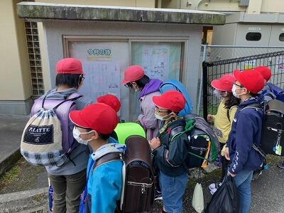写真は、朝の登校風景です。今月の詩が掲示してある掲示板の前で声に出して読んでいます。