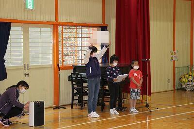 1・2年生は、感謝の気持ちを込めた替え歌やクイズ、メダルのプレゼントでした。メダルをもらった6年生はとても嬉しそうでした。