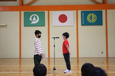 5年生は、6年生との対決をしました。大声、たたいてかぶってじゃんけんぽん、早口言葉の3本勝負で、何と5年生が全てに勝利しました。会場は笑いの渦に包まれました。