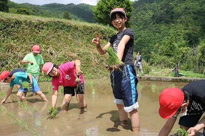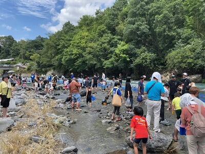 魚のつかみ取りは運動場横の川で行われ、放流されたヤマメやニジマスを子どもたちが元気いっぱいに追いかけていました。帰省してきた子どもたちも多かったようです。