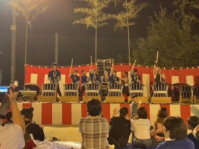 午後7時からはステージ発表でした。台風やコロナ禍により、このステージ発表は5年ぶりに開催とのことでした。尾向小学校の子どもたちは、子ども会の活動としてダンスを発表しました。その他にも、太鼓発表、講談や落語、カラオケなどがあり大いに盛り上がりました。会場のあちこちで再会を懐かしむ声が聞かれ、この祭りが多くの人たちの心のよりどころになっていると感じました。