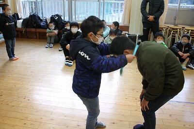 5年生は、6年生との対決をしました。大声、たたいてかぶってじゃんけんぽん、早口言葉の3本勝負で、何と5年生が全てに勝利しました。会場は笑いの渦に包まれました。