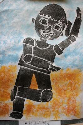 5・6年生も木版画多色刷りです。色は裏から塗りました。台紙にも自分なりの工夫をしています。