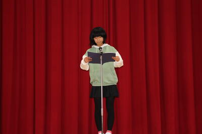 今日は、はじめの言葉、作文発表(3名)、1・2年生の発表を紹介します。