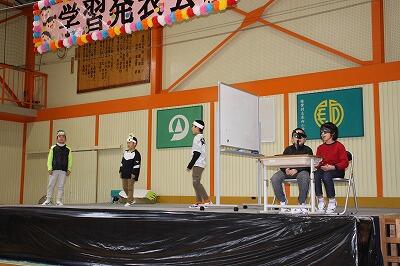 椎葉村学で学習した「尾向の方言を使った大きなカブ」、算数や社会などで学習した内容のクイズ、長縄の披露をしました。5人で一生懸命がんばる姿に胸を打たれました。