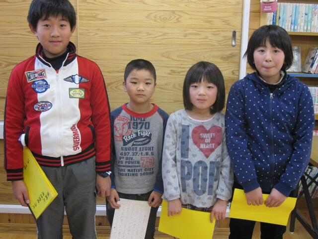 ・ いよいよ3学期がスタートしました。子ども達の元気な顔が見たくて、今朝も郵便局のところで立って待っていました。期待通り、みんな元気な挨拶をしてくれ、全員が登校してくれました。また、地区の方の中には、新年だからかわざわざ車を降りて挨拶をしてくださる方もいらっしゃって、大変恐縮するとともに、元気をいただきました。写真の4名は、始業式の中で代表として抱負などを語ってくれた子ども達です。