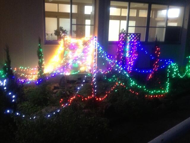 ・ 先週から、校舎内・外にイルミネーションをつけています。昨年も玄関には少ししたのですが、今年は、それに加えて3月に玄関横に作ったコニファーガーデンにも飾りを付けました。子ども達がとても喜んでくれています。(電球は、全てLED電球を使っています。)