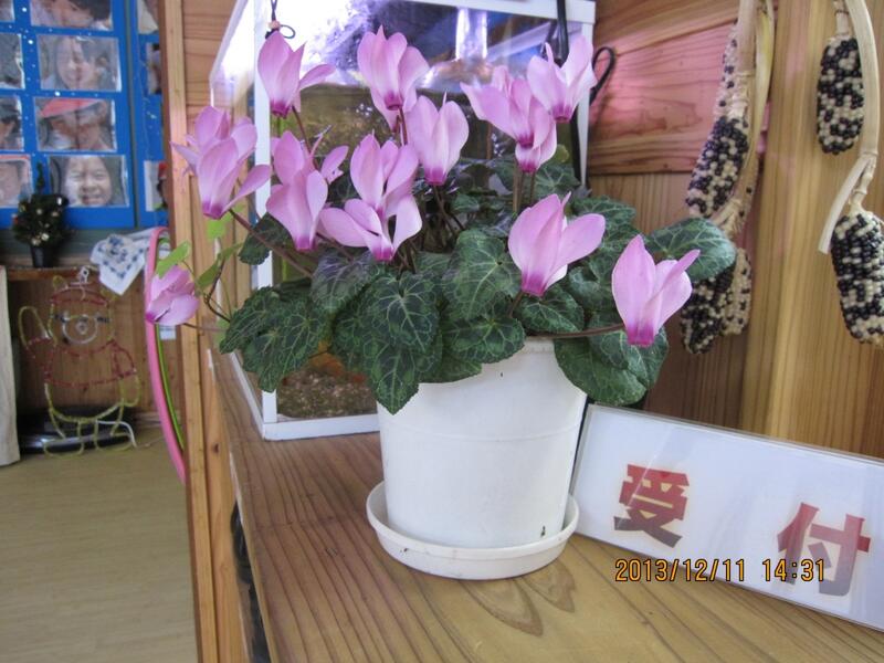・ この写真のシクラメン、花が咲いている方は、昨年も同じように花を咲かせたものです。気候が合うのでしょう、今年もこのように咲いてくれました。また、葉だけのものは、なんと昨年、シクラメンの下に落ちていた種を、校務員の椎葉さんが大切に大切に蒔いて、このように育てられたものです。これと同じような鉢が合わせて8鉢もできました。シクラメンを種から育てられたと言う話をはじめて聞いたのでここに記しました。