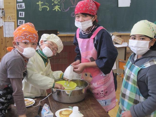 ・ 写真は中学年がホットケーキを作っているところです。ホイップクリームを泡立てたり、ホットケーキの粉を混ぜたりしていました。今日の給食はクリスマスメニューだけど、両方とも食べられるかな?ちなみに、本校は毎日給食の残滓はありません。みんな食欲旺盛です。食は元気の源、頼もしい限りです。