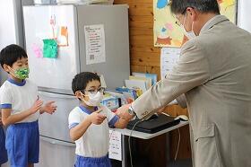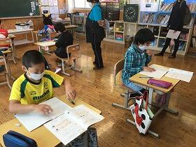 参観日を実施しました。教科の学習や夏休みの研究発表、タブレットの活用など、それぞれの学級で子どもたちが活躍しました。3・4校時は延期になっていた世代間交流でした。コロナウイルス感染対策のため内容を一部変更し、鼓笛発表とひえつき節の踊りの講習を実施しました。参加していただいたおじいちゃんやおばあちゃんは鼓笛の発表に感動している様子でした。ひえつき節の踊りは短い時間でしたが、おじいちゃんおばあちゃん方が丁寧に教えてくださったので子どもたちはしっかり踊れました。その後、給食の試食をしていただきました。有意義な交流ができました。