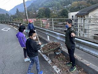 その前に、子供たちは朝早くから校舎前や学校前の道路を落ち葉はきです。