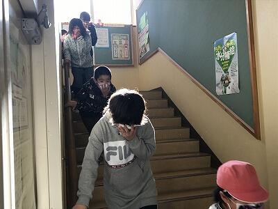 今回は、給食室から火災発生という想定で、火災警報機が鳴り、火元を確認し初期消火のために先生方が駆けつけ、消火器で消せないと校長が判断し、緊急放放送の後、素早く整然と避難することができました。